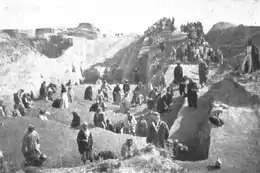 Malgré quelques confusions possibles avec les sites voisins de Birs Nimrud (Borsippa) et Aqar Quf (Dur-Kurigalzu) où les ruines des ziggurats rappelaient la Tour de Babel, l'emplacement du site de Babylone ne fut jamais réellement perdu, une partie de celui-ci conservant son ancien nom, Bābil. Plusieurs voyageurs venus d'Europe visitèrent ses ruines : Benjamin de Tudèle au XIIe siècle, Pietro della Valle au XVIIe siècle, et au XVIIIe siècle l'abbé de Beauchamp, un diplomate français[2]. Le premier à y effectuer un travail scientifique fut le Britannique Claudius James Rich, qui établit au début du XIXe siècle le premier travail de cartographie du site, travail pionnier dans l'exploration scientifique de la Mésopotamie[3]. Plusieurs de ses compatriotes le suivirent sur le site, notamment Austen Henry Layard en 1850 et Henry Rawlinson en 1854, deux des principaux découvreurs des sites des capitales assyriennes, qui y restèrent peu de temps car le site de Babylone présentait moins de découvertes spectaculaires que ceux du nord de la Mésopotamie, ce qui explique pourquoi il resta en marge des principales fouilles de cette période. En 1852, des Français entreprirent des fouilles sur le site, dirigés par Fulgence Fresnel assisté de Jules Oppert et de Félix Thomas[4]. Les maigres découvertes (des sépultures avant tout), qu'ils firent au cours de fouilles menées dans un contexte difficile, ne purent être rapatriées en France car le convoi fluvial qui les transportait (qui transportait surtout des bas-reliefs assyriens) fut attaqué par des tribus hostiles dans le sud de l'Irak et coula en 1855. Après ces premiers chantiers, le site de Babylone fut régulièrement parcouru par des fouilleurs dans la seconde moitié du XIXe siècle . En 1862, le consul français Pacifique-Henri Delaporte trouva une tombe parthe richement dotée en objets qui furent expédiés au musée du Louvre. Des habitants locaux qui jusqu'à présent collectaient surtout des briques sur place s'emparèrent aussi des objets anciens qu'ils y trouvaient pour les revendre sur les marchés voisins. Cela se faisait parallèlement à des fouilles, organisées par des équipes britanniques, sous la direction d'Hormuzd Rassam dans les années 1870, qui réussit à rapporter plusieurs objets de choix au British Museum, notamment le cylindre de Cyrus. Les fouilles britanniques reprirent de temps en temps sur fond de scandale lié à des soupçons de collusion entre fouilleurs clandestins et Rassam, avant que les Allemands ne s'intéressent à Babylone à partir de 1897.