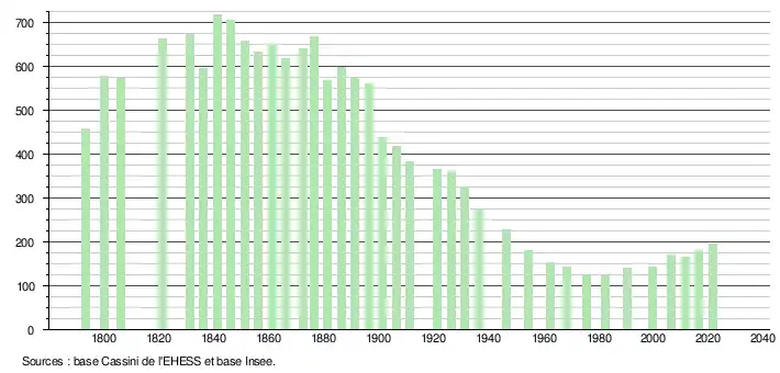 | L'évolution du nombre d'habitants est connue à travers les recensements de la population effectués dans la commune depuis 1793. Pour les communes de moins de 10 000 habitants, une enquête de recensement portant sur toute la population est réalisée tous les cinq ans, les populations légales des années intermédiaires étant quant à elles estimées par interpolation ou extrapolation[35]. Pour la commune, le premier recensement exhaustif entrant dans le cadre du nouveau dispositif a été réalisé en 2006[36]. En 2021, la commune comptait 196 habitants[Note 5], en augmentation de 12 % par rapport à 2015 (Lot : +0,89 %, France hors Mayotte : +1,84 %). |