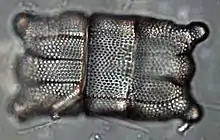 Les Bacillariophyta, ou Diatomées, sont un embranchement d'eucaryotes unicellulaires (de deux micromètres à un millimètre) présents dans tous les milieux aquatiques et majoritaires dans certains biofilms[3] (avec une préférence pour les eaux froides) et enveloppés par un squelette externe siliceux nommé frustule.