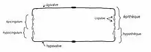 Chez de nombreuses diatomées pennales, une fente, de longueur variable, parcourant les deux valves ou une seule, souvent en leur milieu, est appelée « raphé » et constitue un canal de communication avec l'extérieur et sert à la locomotion par excrétion du mucilage (voir les schémas du frustule de P. viridis, d'après Van den Hoek et al., 1995). Le raphé est interrompu en son milieu par un épaississement siliceux, le nodule central, et possède un nodule terminal à chaque extrémité. Si le raphé est en position médiane, il est situé dans une zone sans ornementations, l'aire longitudinale. Le nodule central est, lui, localisé dans l'aire centrale. Les diatomées dites monoraphidées sont dépourvues de raphé sur la valve supérieure et présentent une ornementation différente sur les deux valves. Les diatomées centrales[alpha 1] et certaines diatomées pennales sont dites araphidées (ou araphides) car elles ne possèdent aucun raphé.