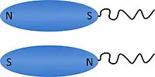 Or, le champ magnétique de la Terre étant incliné sous l’horizontale dans l’hémisphère nord, et au-dessus dans l’hémisphère sud, les bactéries qui suivent les lignes de champ en s'approchant de l'un des pôles ont tendance à "descendre". Elles migrent donc en s’enfonçant dans les sédiments le long des lignes de champ géomagnétique[4]. En regardant un schéma du champ magnétique terrestre (voir exemple ci-contre), on observe que les lignes de champ magnétique partent du noyau de la Terre, se dirigent vers le sud, puis partent vers le nord en formant des arcs de cercle avant de finalement revenir au noyau. De ce fait, lorsque les bactéries magnétotactiques au nord suivent les lignes de champ vers son pôle, elles ont tendance à s'enfoncer. Au sud, elles vont dans le sens contraire, et s'enfoncent par conséquent sous les sédiments.
