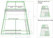 En double, les équipes s’affrontent sur la totalité du terrain, le couloir compte. La zone de service est délimitée par :