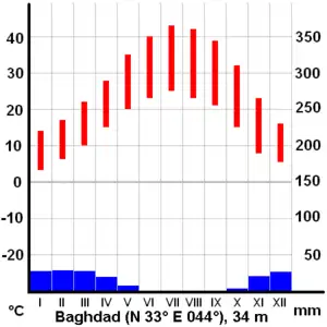 Le climat désertique de Bagdad en fait l'une des plus chaudes régions du monde pendant l'été, surtout quand le vent du golfe Persique souffle (on atteint environ 45 °C en juillet). En hiver, la pluviosité est de 136 mm[7] et le thermomètre oscille en moyenne entre 6 et 18 °C en décembre, et entre 4 et 16 °C en janvier. Il y a une douzaine de jours de gel par an, avec des températures parfois assez basses (minimum de −6 °C)[8].
