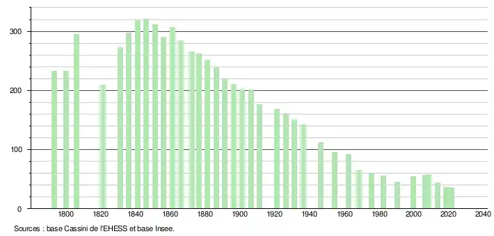 L'évolution du nombre d'habitants est connue à travers les recensements de la population effectués dans la commune depuis 1793. Pour les communes de moins de 10 000 habitants, une enquête de recensement portant sur toute la population est réalisée tous les cinq ans, les populations légales des années intermédiaires étant quant à elles estimées par interpolation ou extrapolation[42]. Pour la commune, le premier recensement exhaustif entrant dans le cadre du nouveau dispositif a été réalisé en 2008[43].