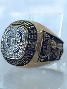 La première bague de champion a été faite en or jaune avec un seul diamant rond au milieu de celle-ci et les inscriptions « Green Bay Packers World Champions 1966 » autour du diamant[3]. En général, le nombre de diamants sur la bague représente le nombre de Super Bowls remportés par la franchise[4]. La bague de vainqueur du Super Bowl la plus large créée est d'une taille 23 pour le joueur William Perry après qu'il a remporté le Super Bowl XX[Note 2],[5].