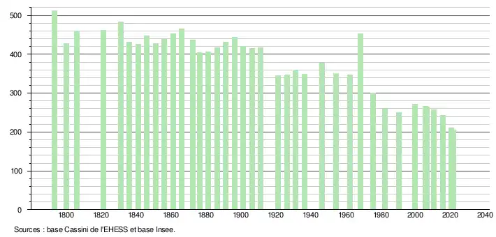 L'évolution du nombre d'habitants est connue à travers les recensements de la population effectués dans la commune depuis 1793. Pour les communes de moins de 10 000 habitants, une enquête de recensement portant sur toute la population est réalisée tous les cinq ans, les populations légales des années intermédiaires étant quant à elles estimées par interpolation ou extrapolation[28]. Pour la commune, le premier recensement exhaustif entrant dans le cadre du nouveau dispositif a été réalisé en 2005[29].
