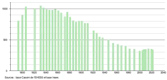 L'évolution du nombre d'habitants est connue à travers les recensements de la population effectués dans la commune depuis 1793. Pour les communes de moins de 10 000 habitants, une enquête de recensement portant sur toute la population est réalisée tous les cinq ans, les populations légales des années intermédiaires étant quant à elles estimées par interpolation ou extrapolation[23]. Pour la commune, le premier recensement exhaustif entrant dans le cadre du nouveau dispositif a été réalisé en 2004[24].