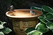 Un bain d'oiseaux ou baignoire pour oiseaux est un ornement de jardin visant à attirer les oiseaux. Ce récipient rempli d'eau, conçu le plus souvent en forme de soucoupe, permet à de nombreuses espèces de passereaux de s'y baigner afin de nettoyer leurs plumes, soulager leurs peaux des parasites et s'hydrater[1]. Il se décline sous de nombreux styles et variétés, suspendus ou sur pied. Les modèles classiques, rococos et modernes, demeurent des fantaisies de jardin populaires. Les matériaux les plus couramment utilisés dans la composition d’une baignoire pour oiseaux sont la pierre, le ciment, le verre ou la résine de synthèse.