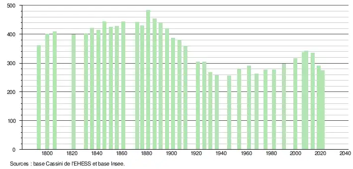 L'évolution du nombre d'habitants est connue à travers les recensements de la population effectués dans la commune depuis 1793. Pour les communes de moins de 10 000 habitants, une enquête de recensement portant sur toute la population est réalisée tous les cinq ans, les populations légales des années intermédiaires étant quant à elles estimées par interpolation ou extrapolation[17]. Pour la commune, le premier recensement exhaustif entrant dans le cadre du nouveau dispositif a été réalisé en 2008[18].