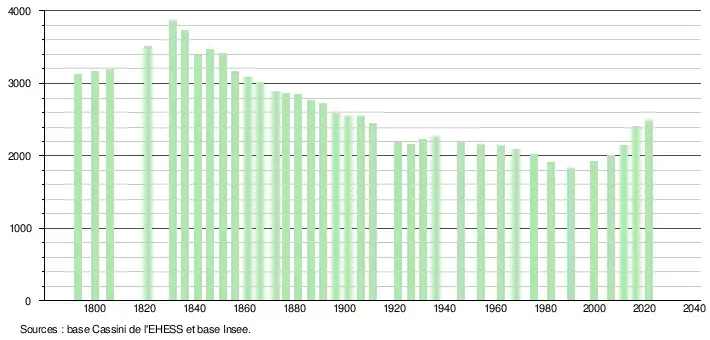 L'évolution du nombre d'habitants est connue à travers les recensements de la population effectués dans la commune depuis 1793. Pour les communes de moins de 10 000 habitants, une enquête de recensement portant sur toute la population est réalisée tous les cinq ans, les populations légales des années intermédiaires étant quant à elles estimées par interpolation ou extrapolation[40]. Pour la commune, le premier recensement exhaustif entrant dans le cadre du nouveau dispositif a été réalisé en 2006[41].