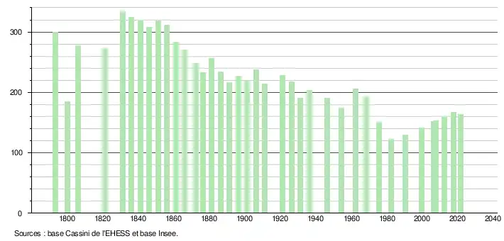 L'évolution du nombre d'habitants est connue à travers les recensements de la population effectués dans la commune depuis 1793. Pour les communes de moins de 10 000 habitants, une enquête de recensement portant sur toute la population est réalisée tous les cinq ans, les populations légales des années intermédiaires étant quant à elles estimées par interpolation ou extrapolation[13]. Pour la commune, le premier recensement exhaustif entrant dans le cadre du nouveau dispositif a été réalisé en 2007[14].