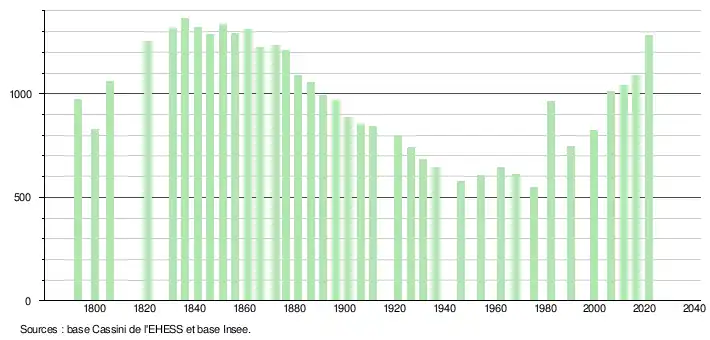 L'évolution du nombre d'habitants est connue à travers les recensements de la population effectués dans la commune depuis 1793. Pour les communes de moins de 10 000 habitants, une enquête de recensement portant sur toute la population est réalisée tous les cinq ans, les populations légales des années intermédiaires étant quant à elles estimées par interpolation ou extrapolation[22]. Pour la commune, le premier recensement exhaustif entrant dans le cadre du nouveau dispositif a été réalisé en 2006[23].