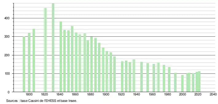 | L'évolution du nombre d'habitants est connue à travers les recensements de la population effectués dans la commune depuis 1793. Pour les communes de moins de 10 000 habitants, une enquête de recensement portant sur toute la population est réalisée tous les cinq ans, les populations légales des années intermédiaires étant quant à elles estimées par interpolation ou extrapolation[23]. Pour la commune, le premier recensement exhaustif entrant dans le cadre du nouveau dispositif a été réalisé en 2008[24]. En 2021, la commune comptait 111 habitants[Note 2], en augmentation de 9,9 % par rapport à 2015 (Gers : +0,79 %, France hors Mayotte : +1,84 %). |