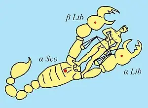 Les Grecs connaissent en effet tout d’abord la figure nommée Κηλαί / Kēlaí, « les Pinces », attestée chez Eudoxe puis empruntée aux Mésopotamiens comme partie de Σκορπίος / Skorpíos[5]. Bien après, lorsqu’ils héritent du zodiaque, ils appellent de ce même nom, Κηλαί / Kēlaí, le signe placé entre Λέων / Léōn et Σκορπίος / Skorpíos, que les Mésopotamiens n’ont, pour leur part, jamais désigné d’autre manière que par [E]RÍN = gišrinnu, « la Balance ». C’est bien plus tard encore, à partir de Geminos, que l’astronomie hellénistique finit par conférer au signe zodiacal le nom Ζυγός / Zugós, « fléau d’une balance, d'où balance »[6], à l’instar de l’araméen Qanyā [šalmā], « le Fléau [juste] ». Cette dualité de figures est parfaitement rendue par le zodiaque du naos du temple de de Bēl à Tadmor / Palmyre, construit en 32 de notre ère et récemment détruit par Daech. On y voyait un Grand Scorpion embrassant dans ses Pinces un personnage soutenant une balance. Naturellement les Grecs adaptent cette figure à leur propre imaginaire. Selon Ératosthène, La constellation est vue comme la balance où Zeus plaça le sort des Grecs et des Troyens pendant la guerre de Troie, soit considérée comme étant la balance d'Astrée (ou Thémis) lorsque cette dernière quitta la terre pour devenir la constellation de la Vierge. On pense que ce sont les Romains qui ont introduit cette constellation dans le corpus[7].