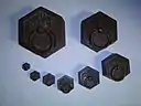 Les poids en fonte ont une forme de pyramide tronquée quadrangulaire pour les poids de plus de 10 kg, et une forme de pyramide tronquée hexagonale pour les poids de 10 kg à 50 g.