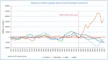 | Sources : Eurostat[11] Commerce international de l'Eurozone19 - données mensuelles [ei_etea19_m] |