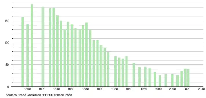 L'évolution du nombre d'habitants est connue à travers les recensements de la population effectués dans la commune depuis 1793. Pour les communes de moins de 10 000 habitants, une enquête de recensement portant sur toute la population est réalisée tous les cinq ans, les populations légales des années intermédiaires étant quant à elles estimées par interpolation ou extrapolation[28]. Pour la commune, le premier recensement exhaustif entrant dans le cadre du nouveau dispositif a été réalisé en 2007[29].