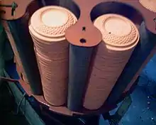 Cinq groupes de trois appareils de lancement distribuent les plateaux selon des angles différents suivant un schéma réglementaire.