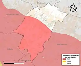 Le retrait-gonflement des sols argileux est susceptible d'engendrer des dommages importants aux bâtiments en cas d’alternance de périodes de sécheresse et de pluie. 63,8 % de la superficie communale est en aléa moyen ou fort (54,2 % au niveau départemental et 48,5 % au niveau national). Sur les 143 bâtiments dénombrés sur la commune en 2019, 12 sont en aléa moyen ou fort, soit 8 %, à comparer aux 57 % au niveau départemental et 54 % au niveau national. Une cartographie de l'exposition du territoire national au retrait gonflement des sols argileux est disponible sur le site du BRGM[17],[Carte 2].