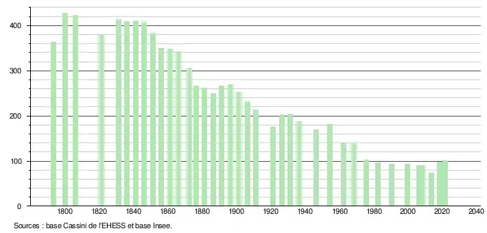 L'évolution du nombre d'habitants est connue à travers les recensements de la population effectués dans la commune depuis 1793. Pour les communes de moins de 10 000 habitants, une enquête de recensement portant sur toute la population est réalisée tous les cinq ans, les populations légales des années intermédiaires étant quant à elles estimées par interpolation ou extrapolation[15]. Pour la commune, le premier recensement exhaustif entrant dans le cadre du nouveau dispositif a été réalisé en 2008[16].
