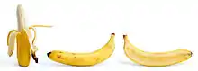 La banane est une baie allongée légèrement incurvée, souvent regroupée sur le bananier en grappes nommées « régimes » dont il est facile de la détacher. Le fruit est constitué d'une « peau » (épicarpe[16] jaune, vert ou rouge, selon les espèces et le niveau de maturité, recouvrant une zone sous-épidermique chlorophyllienne) et d'une pulpe (mésocarpe à grosses cellules ovoïdes amylifères, donnant à la chair un goût sucré et une consistance généralement fondante, et endocarpe entourant les ovules avortés). Les cavités carpellaires médianes comportent les ovules et leurs placentas, ainsi que des poils microscopiques mous amylacés[17].