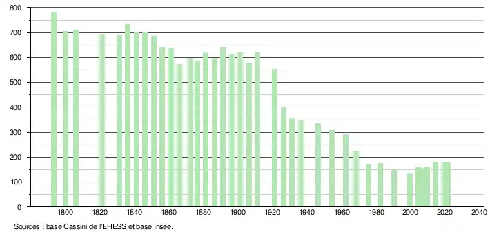 L'évolution du nombre d'habitants est connue à travers les recensements de la population effectués dans la commune depuis 1793. Pour les communes de moins de 10 000 habitants, une enquête de recensement portant sur toute la population est réalisée tous les cinq ans, les populations légales des années intermédiaires étant quant à elles estimées par interpolation ou extrapolation[25]. Pour la commune, le premier recensement exhaustif entrant dans le cadre du nouveau dispositif a été réalisé en 2004[26].