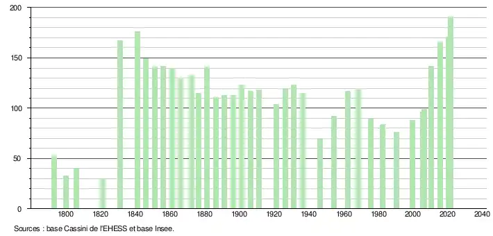 L'évolution du nombre d'habitants est connue à travers les recensements de la population effectués dans la commune depuis 1793. Pour les communes de moins de 10 000 habitants, une enquête de recensement portant sur toute la population est réalisée tous les cinq ans, les populations légales des années intermédiaires étant quant à elles estimées par interpolation ou extrapolation[26]. Pour la commune, le premier recensement exhaustif entrant dans le cadre du nouveau dispositif a été réalisé en 2005[27].