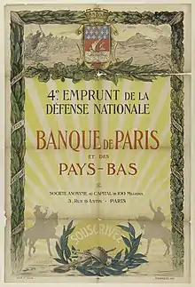 Mais la banque sort très affaiblie du Premier conflit mondial et dans une Europe déstabilisée par la guerre et gangrénée par l’inflation, elle réoriente ses activités : d’une part, vers le financement d’initiatives en Europe centrale qui devaient donner à la France des positions clés dans la région, et d’autre part, elle définit et met en œuvre une politique industrielle ambitieuse en France et à l’étranger. Cette période est largement dominée par la figure d’Horace Finaly (1871-1945)[13], directeur général de l’établissement bancaire entre 1919 et 1937.