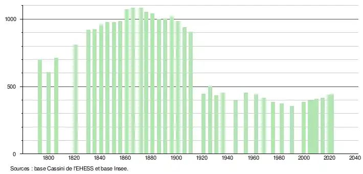 L'évolution du nombre d'habitants est connue à travers les recensements de la population effectués dans la commune depuis 1793. Pour les communes de moins de 10 000 habitants, une enquête de recensement portant sur toute la population est réalisée tous les cinq ans, les populations légales des années intermédiaires étant quant à elles estimées par interpolation ou extrapolation[26]. Pour la commune, le premier recensement exhaustif entrant dans le cadre du nouveau dispositif a été réalisé en 2004[27].