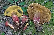 Comme son nom l'indique, le Bolet bicolore est entièrement teinté de jaune et de rouge. C'est un champignon à la silhouette plutôt trapue, dont le chapeau mesure entre 4 et 15 cm de diamètre et le pied de 5 à 10 cm de long pour 1 à 3 cm d'épaisseur[6]. Dans le jeune âge, le chapeau est convexe, finement velouté et rouge vineux. Il s'étale en vieillissant, devient lisse et se décolore parfois pour prendre une teinte jaune rosé. Les tubes sont d'abord jaunes puis jaune olivâtre et plus courts que la plupart des bolets. Ils sont adnés, puis échancrés, et leurs pores sont si petits qu'on les distingue difficilement chez les jeunes spécimens. Ils sont concolores aux tubes et bleuissent au froissement[7]. Le stipe est souvent clavé vers la base, plein et glabre. Il est rouge vineux teinté de jaune vers l'apex[6]. La chair est jaune pâle, plus foncée dans le pied, et elle bleuit lentement à la coupe (mais plus faiblement que les pores). Sa saveur est douce et son odeur indistincte. La sporée est brun olive[7].