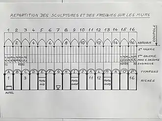 Les fresques de la coupole se répartissent de la façon suivante (là aussi la numérotation commence au secteur où se trouve l’autel) :