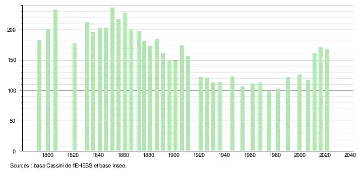 L'évolution du nombre d'habitants est connue à travers les recensements de la population effectués dans la commune depuis 1793. Pour les communes de moins de 10 000 habitants, une enquête de recensement portant sur toute la population est réalisée tous les cinq ans, les populations légales des années intermédiaires étant quant à elles estimées par interpolation ou extrapolation[28]. Pour la commune, le premier recensement exhaustif entrant dans le cadre du nouveau dispositif a été réalisé en 2006[29].