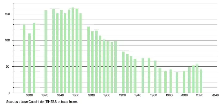 | L'évolution du nombre d'habitants est connue à travers les recensements de la population effectués dans la commune depuis 1793. Pour les communes de moins de 10 000 habitants, une enquête de recensement portant sur toute la population est réalisée tous les cinq ans, les populations légales des années intermédiaires étant quant à elles estimées par interpolation ou extrapolation[19]. Pour la commune, le premier recensement exhaustif entrant dans le cadre du nouveau dispositif a été réalisé en 2006[20]. En 2021, la commune comptait 45 habitants[Note 4], en diminution de 18,18 % par rapport à 2015 (Hautes-Pyrénées : +1,04 %, France hors Mayotte : +1,84 %). |