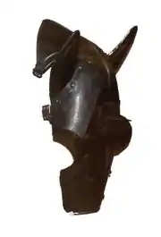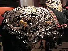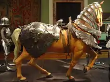 La barde de croupe protège l'arrière du cheval. Elle peut être fabriquée à partir d'une combinaison de cuir, de chaînes, ou de plaques.