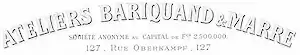 En 1900, la société en nom collectif Bariquand & Marre est transformée en Société anonyme. Elle exploite des ateliers de mécanique et de fabrication diverses, 127, rue Oberkampf, rue Moret, Impasse Monti et Cité Griset à Paris sous la direction d'Émile Bariquand. Entre 1901 et 1906 le nombre d'ouvriers oscille de 300 à 450[5].