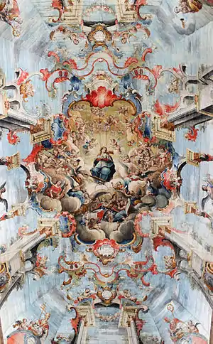 Mestre Ataíde, détail de l’Ascension du Christ au plafond de l'église matrice de Saint-Antoine à Santa Bárbara. Cette composition centrale de traits baroques insérés dans un cadre clairement rococo met en évidence les superpositions stylistiques qui ont caractérisé à la fois le baroque brésilien et l'œuvre de ce maître.