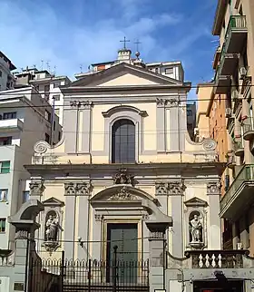 La façade est une sorte de machine de fête extérieure des ordres religieux. Les cas les plus représentatifs d'innovation et d'ancrage dans l'histoire sont offerts par la façade de l'église des Girolamini (des Oratoriens) et celui de l'église San Giorgio Maggiore[5]. Un premier projet de façade à deux campaniles de l'église des Girolamini remonte à 1614 selon une esquisse du père Talpa. Les travaux sont exécutés par Dionisio Lazzari, Arcangelo Guglielmelli, architecte de l'ensemble conventuel jusqu'à sa mort (1723), et enfin par Ferdinando Fuga, qui a terminé le projet. L'avancement des travaux qui ont touché le bâtiment peut être vu dans des panoramas de la ville au XVIIe siècle, les premiers changements ont eu lieu dès 1602, lorsque les Oratoriens ont cédé l'espace à l'avant.