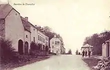 Vue de la Barrière de Champlon (N4 vers Marche), avec l'Hostellerie à g. et à dr. la gendarmerie et le bâtiment de la barrière d'octroi (à l'arr.). vers 1905.