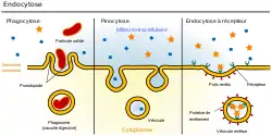 - S'il y a au puits de la membrane, des récepteurs qui se lient spécifiquement à la molécule visée, la vésicule est marquée, transportée et vidée. C'est le cas pour de grosses molécules comme la Lipoprotéine de basse densité (LDL), ingrédient de fabrication du cholestérol[25], l'insuline[26], et d'autres hormones peptidiques.