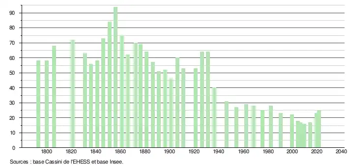 | L'évolution du nombre d'habitants est connue à travers les recensements de la population effectués dans la commune depuis 1793. Pour les communes de moins de 10 000 habitants, une enquête de recensement portant sur toute la population est réalisée tous les cinq ans, les populations légales des années intermédiaires étant quant à elles estimées par interpolation ou extrapolation[27]. Pour la commune, le premier recensement exhaustif entrant dans le cadre du nouveau dispositif a été réalisé en 2004[28]. En 2021, la commune comptait 25 habitants[Note 3], en augmentation de 56,25 % par rapport à 2015 (Hautes-Pyrénées : +1,04 %, France hors Mayotte : +1,84 %). |