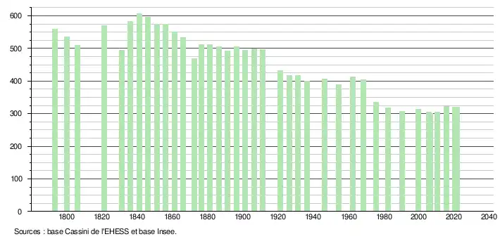 L'évolution du nombre d'habitants est connue à travers les recensements de la population effectués dans la commune depuis 1793. Pour les communes de moins de 10 000 habitants, une enquête de recensement portant sur toute la population est réalisée tous les cinq ans, les populations légales des années intermédiaires étant quant à elles estimées par interpolation ou extrapolation[24]. Pour la commune, le premier recensement exhaustif entrant dans le cadre du nouveau dispositif a été réalisé en 2005[25].