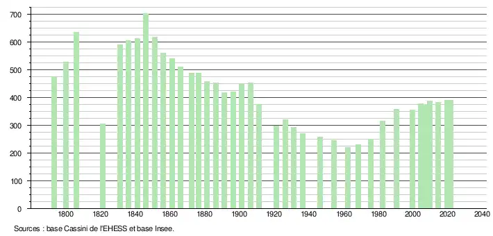 L'évolution du nombre d'habitants est connue à travers les recensements de la population effectués dans la commune depuis 1793. Pour les communes de moins de 10 000 habitants, une enquête de recensement portant sur toute la population est réalisée tous les cinq ans, les populations légales des années intermédiaires étant quant à elles estimées par interpolation ou extrapolation[22]. Pour la commune, le premier recensement exhaustif entrant dans le cadre du nouveau dispositif a été réalisé en 2004[23].