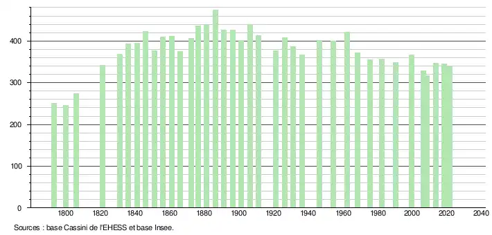 L'évolution du nombre d'habitants est connue à travers les recensements de la population effectués dans la commune depuis 1793. Pour les communes de moins de 10 000 habitants, une enquête de recensement portant sur toute la population est réalisée tous les cinq ans, les populations légales des années intermédiaires étant quant à elles estimées par interpolation ou extrapolation[24]. Pour la commune, le premier recensement exhaustif entrant dans le cadre du nouveau dispositif a été réalisé en 2008[25].