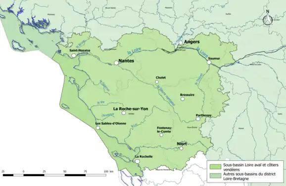 La Vendée est comprise entièrement dans le bassin versant Loire-Bretagne et plus spécifiquement dans le sous-bassin versant "Loire aval et côtiers vendéens"[21] qui comprend aussi le sud de la Loire-Atlantique et du Maine et Loire, l'ouest des Deux-Sèvres et l'Aunis. Dans ce bassin versant, les précipitations venant de l'Atlantique accrochent les hauteurs de l'est du Bas-Poitou (collines vendéennes) et se déversent en direction du littoral, via les vallons traversant les bocages et les plaines. Le réseau hydrographique distribue cette eau de pluie, à l'ouest, vers la Boulogne, la Vie, le Lay, la Vendée et la Sèvre niortaise jusque dans les marais et l'océan Atlantique, et au nord vers la Maine et la Sèvre nantaise et le Thouet qui se jettent dans la Loire, puis dans l'océan Atlantique.