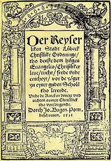 Pourtant l'importance du bas allemand en tant que langue écrite commence à diminuer au XVIe siècle. Au cours de la Réforme, le nombre d'ouvrages imprimés en bas allemand, il est vrai, décolle : ainsi la « Confession de Lübeck », attribuée à Johannes Bugenhagen, est-elle composée dans cette langue. On doit aussi à Bugenhagen une version en bas saxon de la Bible de Luther[39]. Mais cela montre deux choses : d'une part la domination du bas allemand comme langue véhiculaire dans tout le Nord de l'Allemagne et les comptoirs de la Hanse, qui rendait indispensable une édition spécifique de la Bible ; mais aussi la subordination de cette langue à l'allemand des chancelleries, préféré par Luther : car l'édition originale de la bible protestante, servit d'archétype pour la version de Bugenhagen.