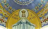 La Vierge Marie est figurée sur une mosaïque monumentale décorant la voûte en cul-de-four du chœur, dont le dessin est dû à Edgard Maxence ; entourée de nombreux anges, bras ouverts, elle présente un geste d'accueil aux pèlerins, accompagnée de la devise qui manifeste son intercession : « Par Marie à Jésus ».