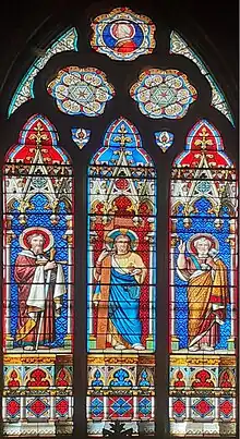 - Les vitraux sur les deux bras du transept représentent des scènes historiques ou de saints personnages en pied. Ceux de la rose et des verrières de la nef sont composés de motifs géométriques complexes encadrés par une bordure à motifs.