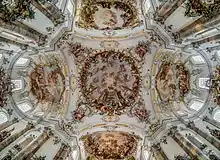 La grande fresque de la partie nord montre une Glorification de saint Benoît et de son ordre[11]. Aux quatre extrémités de la fresque, de petites fresques rejoignent les piliers, et en dessous des figures en stuc. Parmi ces fresques, celle de l'extrémité nord-est montre Benoît et des donateurs. La fresque du transept représente la Pentecôte[12]. On voit la disposition traditionnelle de Marie entourée des apôtres, et le Saint Esprit qui les éclaire. Enfin, la fresque du chœur[13] représente les Neuf chœurs d'anges.