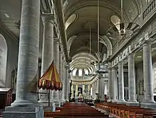 La basilique de style néo-Renaissance construite entre 1843 et 1865[3] affecte un plan en croix latine, les bras du transept se terminant en hémicycle. Nonobstant, la distribution et la circulation internes confèrent à l'édifice un caractère basilical marqué, la croisée n'étant pas d'ailleurs surmontée d'une coupole. La nef centrale, accostée de deux collatéraux, est rythmée par une colonnade toscane portant architrave, frise ornée de triglyphes, et forte corniche. Au-dessus d'une balustrade, l'éclairage est assuré de part et d'autre par trois baies à lunettes dont les voûtes pénètrent celle de la nef, plein-cintre et ornée de caissons. Le chœur poursuit le parti fort sobre de la nef : son hémicycle est entouré d'un déambulatoire sur lequel se greffe seulement une chapelle absidale. L'espace intérieur de la basilique se caractérise donc par une certaine austérité et monochromie qu'altèrent à peine le dallage de marbre noir et blanc et le mobilier d'esprit néoclassique.