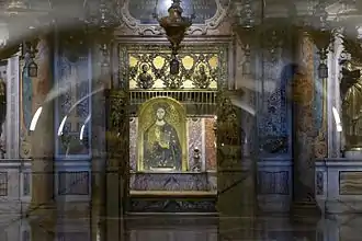 50. Le cercle de m de diamètre en mosaïque est flanqué de deux anges en travertin qui supportent la tiare papale et la clés de saint Pierre. Cf. (en) Maria Beltramini et Alessandro Angeli, The Basilica of St Peter in the Vatican, F.C. Panini, , p. 451.